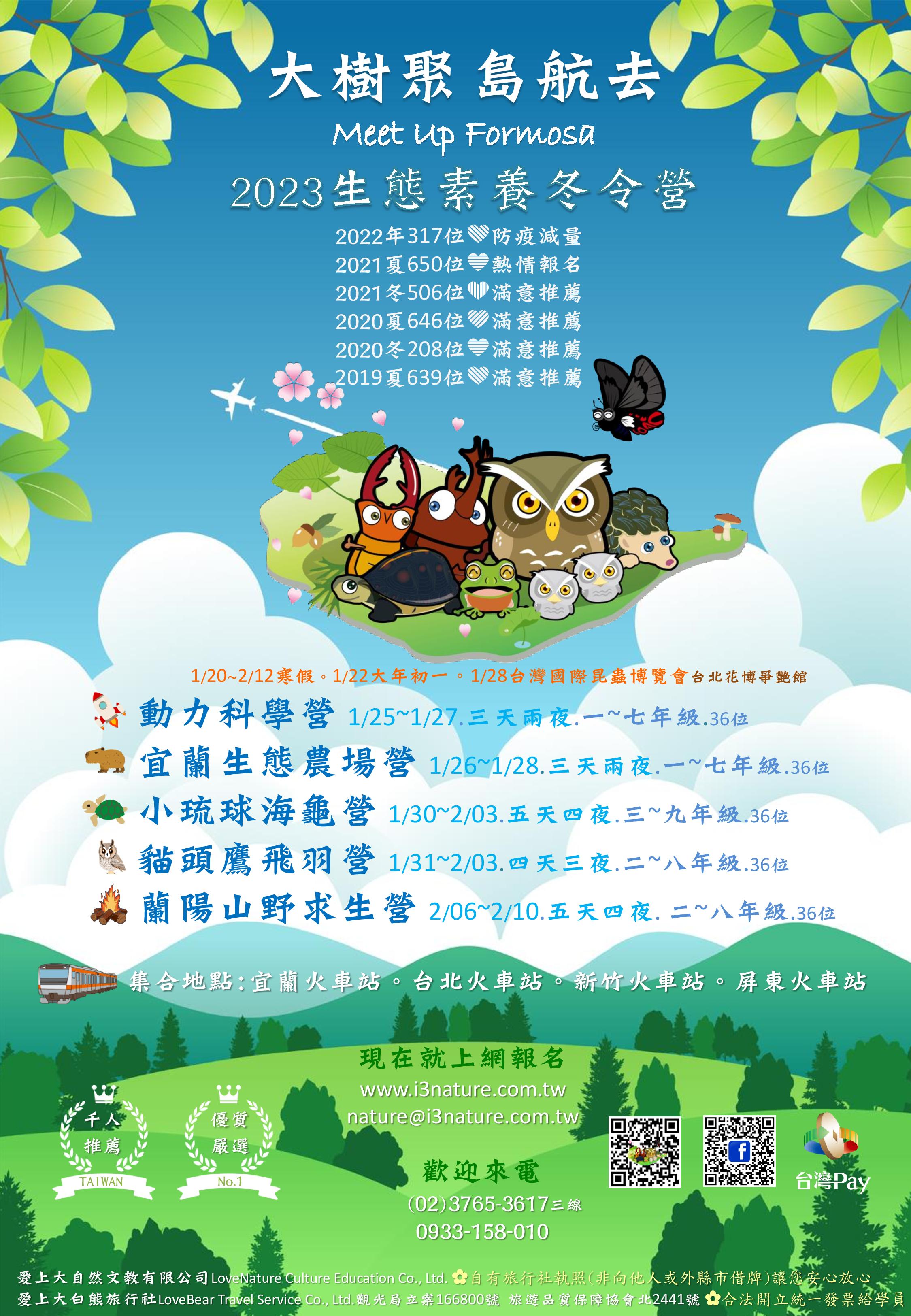 愛上大自然文教有限公司將於112年寒假辦理【大樹聚。島航去】2023生態素養冬令營五個梯次;暨參展2023臺灣國際昆蟲博覽會。