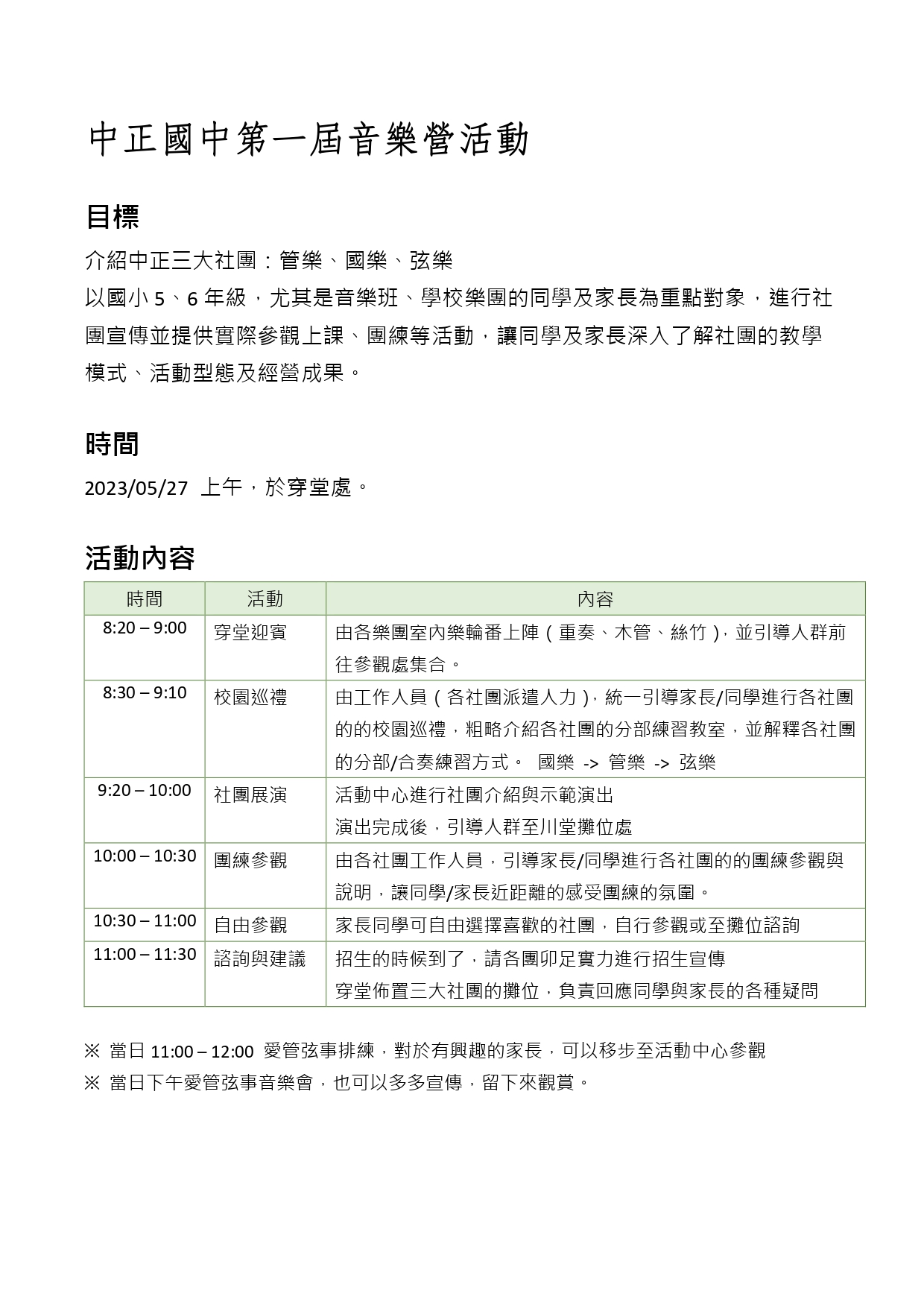 一、活動目標:宣傳本校弦樂、國樂及管樂特色。 二、參加對象:國小5-6年級學生及家長。 三、活動日期及時間:112年5月27日(六),上午8-12時。