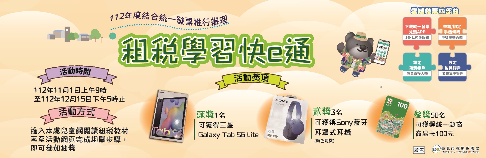 (二)活動內容:國中、國小學生於活動期間至「臺北市稅捐 稽徵處兒童網」觀看租稅教育動畫或漫畫,將閱讀情形拍照上傳活動網頁,並正確回答租稅問題,就有機會獲 三星Galaxy TabS6 Lite、Sony藍牙耳罩式耳機及統一超商商品卡100元等多項好禮!
