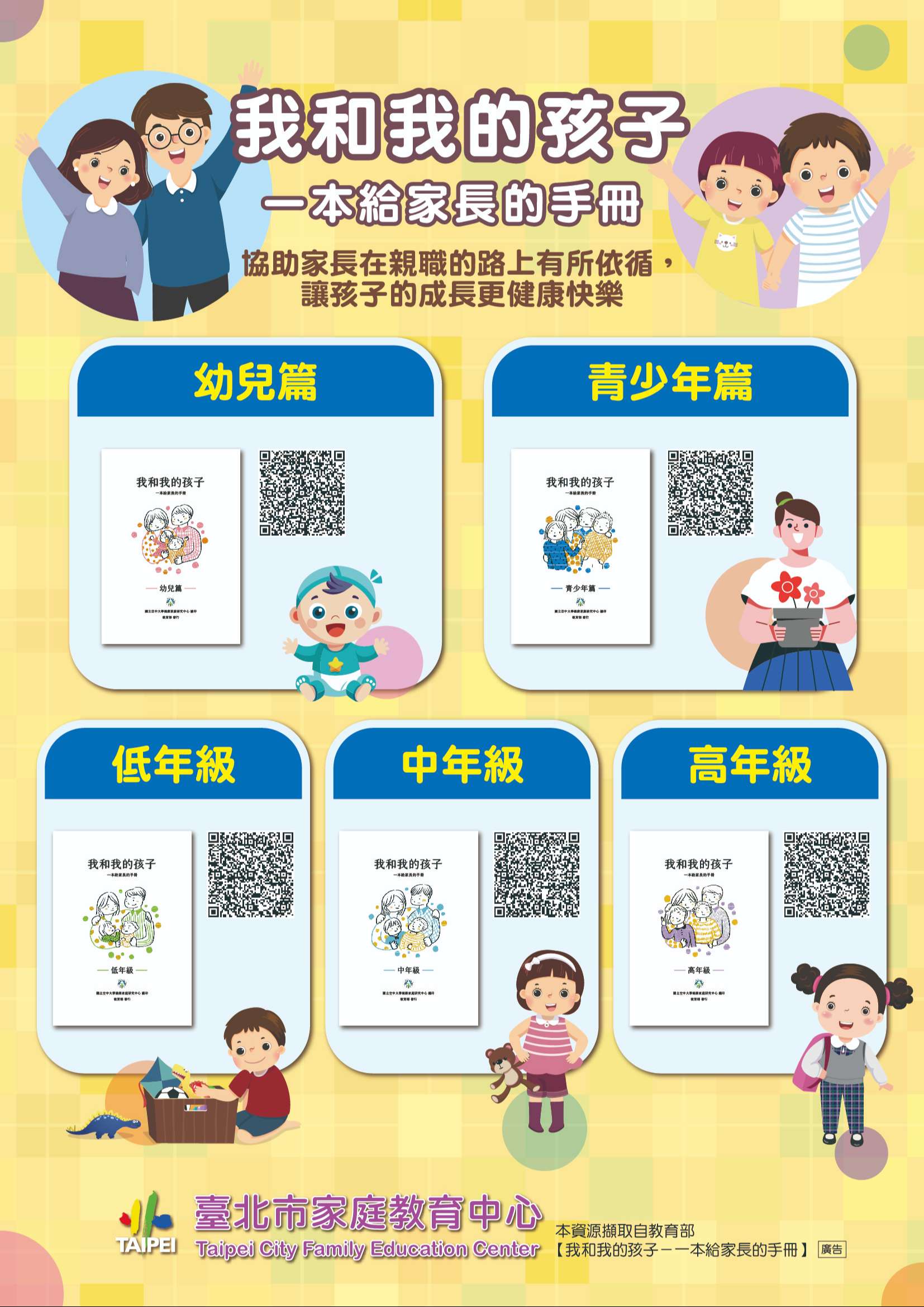 教育手冊(包含幼兒篇、國小篇及青少年篇),針對家有學前、國小及青少年階段孩子的家長,可能面對的親職課