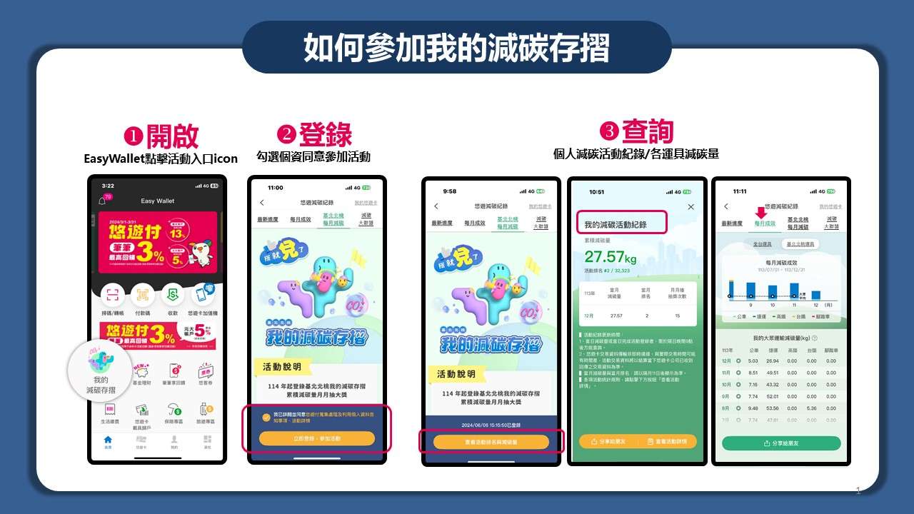 為攜手市民多加使用公共運輸,以朝淨零碳排目標前進, 由政府、企業一起帶動全民綠運輸減碳,113年由基北北桃 四市交通單位、公共運輸業者及悠遊卡股份有限公司共同 推動,114年度擴大辦理並增加兌獎制活動,民眾累積達一 定減碳量即可登錄兌換獎項,提高民眾參與誘因,活動辦 理期間自114年1月1日至12月31日止,詳細內容可至本活動 官網查閱114年活動資訊(https://co2- passbook.com /)。