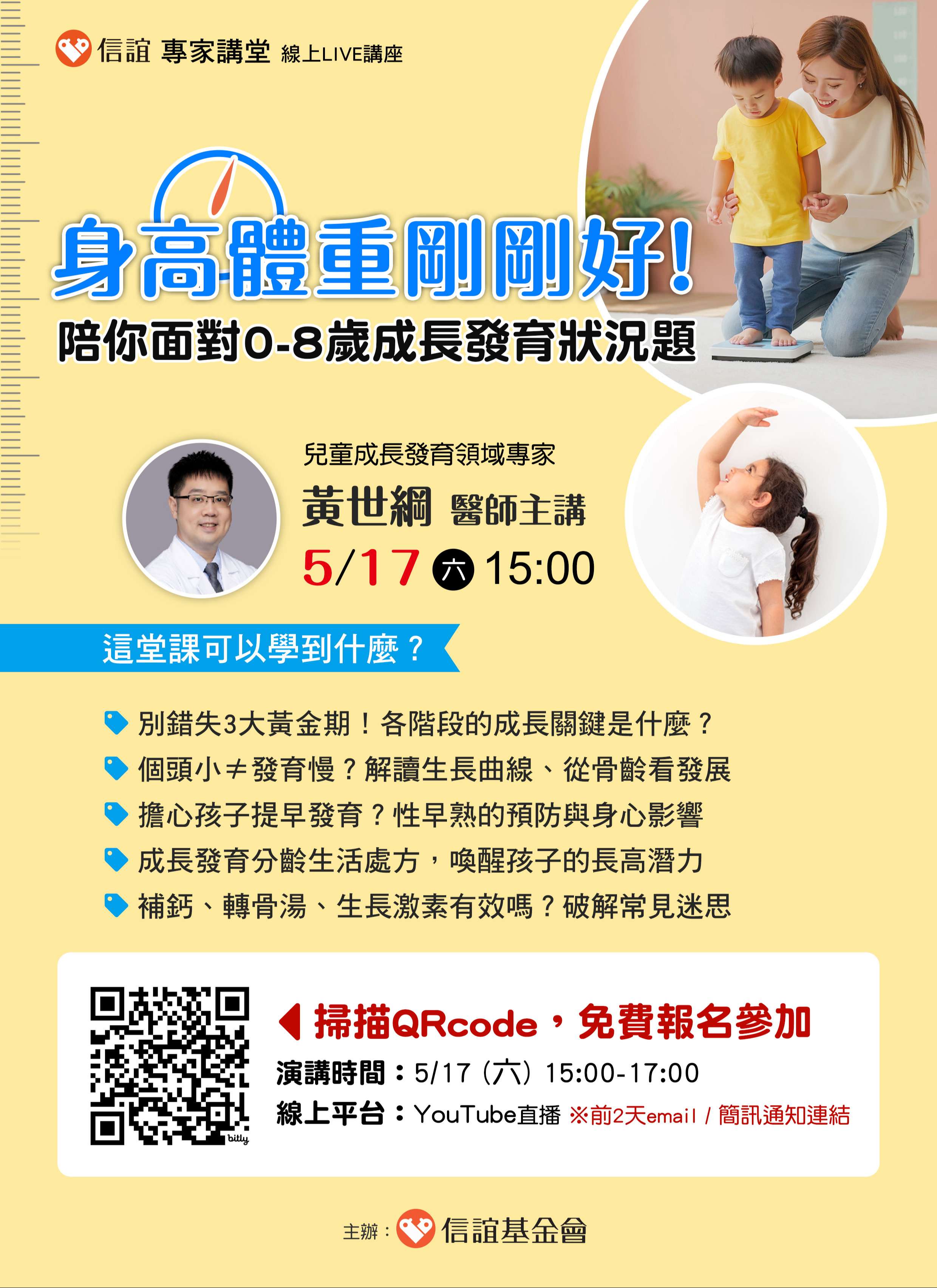月17日(六)下午3:00-5:00舉辦【身高體重剛剛好!陪你面對0-8歲成長發育狀況題】線上LIVE講座,邀請爸媽免