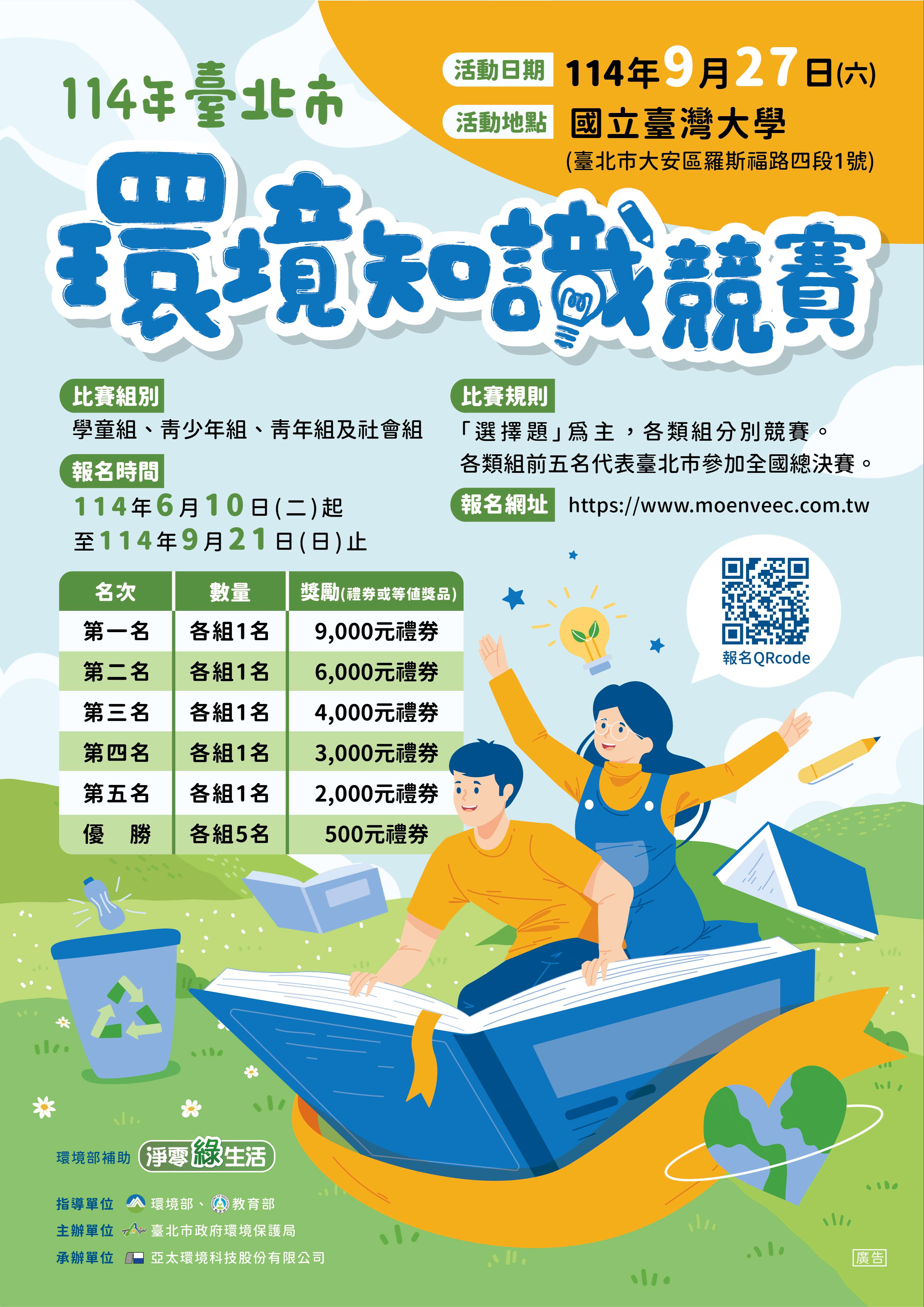 「114年環境知識競賽」訂於114年9月27日(星期 六)假臺灣大學舉行,本市初賽報名日期為6月10日至114年9月21日止,一律採網 路報名,有意參加者請至活動官網(https://www. moenveec.com.tw/)登記報名。詳情如附件