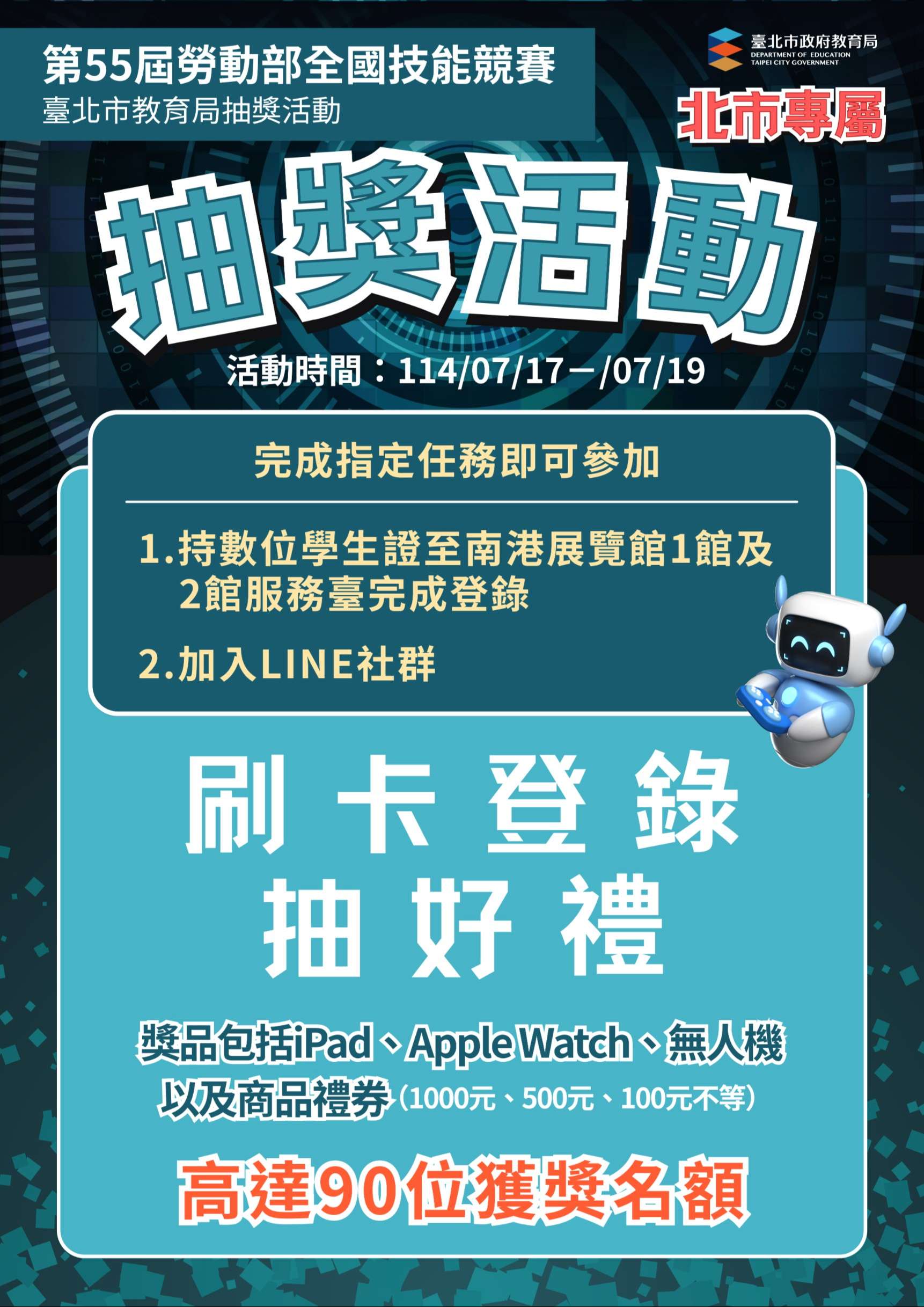 四、現場提供本市學生限定好禮抽獎活動,凡本市各級學校學生持數位學生證至南港展覽館1館及2館,至大會服務臺完