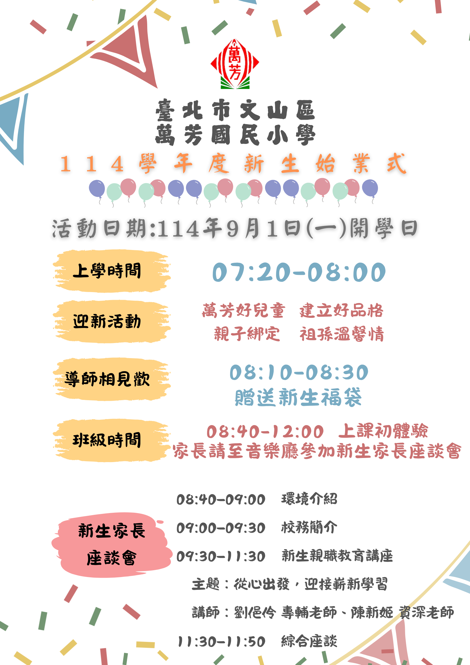 臺北市文山區萬芳國民小學 114 學年度新生始業式暨開學日公告