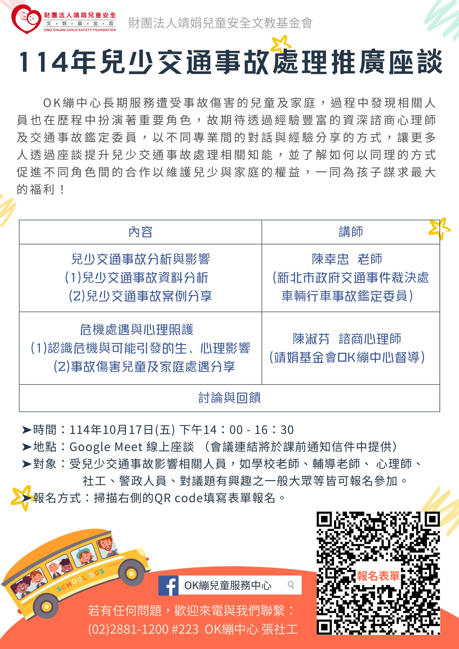 一、靖娟基金會OK繃兒童服務中心將於114年10月17日14時至16 時30分辦理兒少交通事故處理推廣線上座談,期待透過對 話方式交通、心理、社會等角度分享中心協助處理交通事故的服務經驗傳達給更多相關工作者,讓不同專業之間以 同理的態度更了解彼此,一同協助為孩子謀取最大的利益。